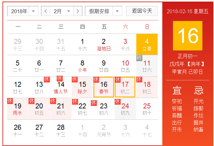 正值中國傳統節日“春節”來臨,在此向各位新老客戶和廣大朋友們拜個早年!預祝大家新春愉快、財源廣進、生意興隆、宏圖大展!按照本公司通知規定,2018年春節放假調休時間為2月13日至2月25日,共12天。 2月11日(星期日)、2月24日(星期六)為上班日。